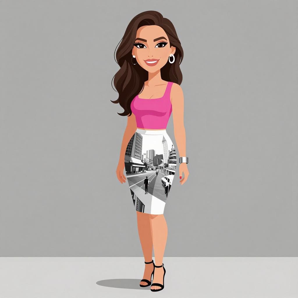 Vector illustration of a smiling woman with long wavy brown hair wearing a vibrant pink cropped tank top with a square neckline and a knee-length pencil skirt featuring a monochromatic urban photographic print. She accessorizes with black high-heeled strappy sandals, pearl earrings, and a chunky silver cuff bracelet. The background is plain gray.