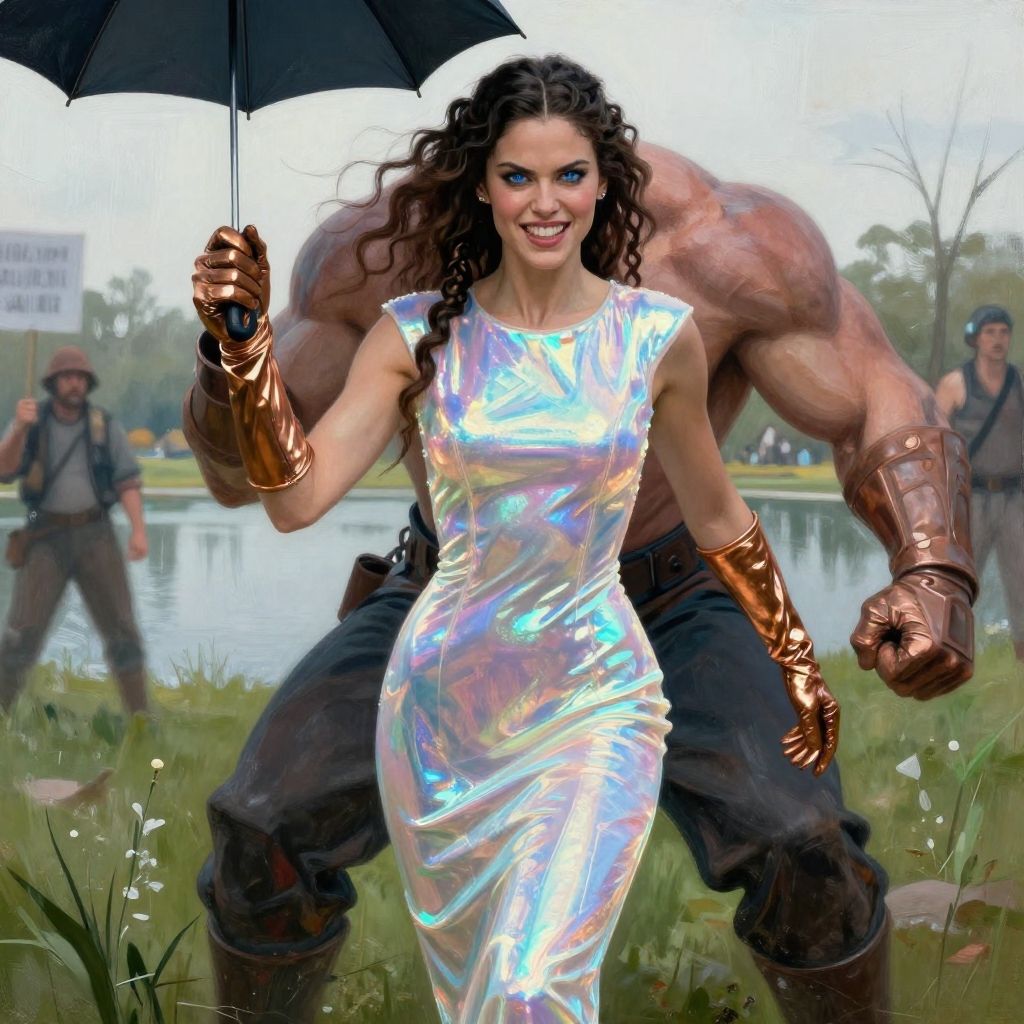 Photograph-style digital artwork depicting a confident woman with long, curly brown hair and striking blue eyeshadow, wearing a shiny, metallic silver dress that reflects light. She holds a black umbrella in her left hand and wears copper-colored gloves. Behind her stands a muscular, shirtless man with bronze-colored skin and large, copper-colored gloves, slightly crouched. The background features a grassy field, a pond, and blurred figures of people in military-style uniforms. A white sign is visible in the distance, partially obscured by trees. The image has a vibrant, almost hyper-realistic color palette.