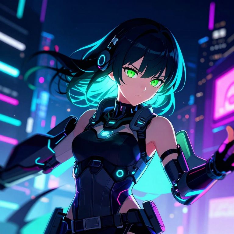 Anime girl with green eyes wearing a futuristic cyberpunk outfit, neon cityscape background at night, glowing elements on clothing and accessories, dynamic pose, intense gaze, highly detailed, sharp lines, vibrant neon colors blending with dark urban environment.