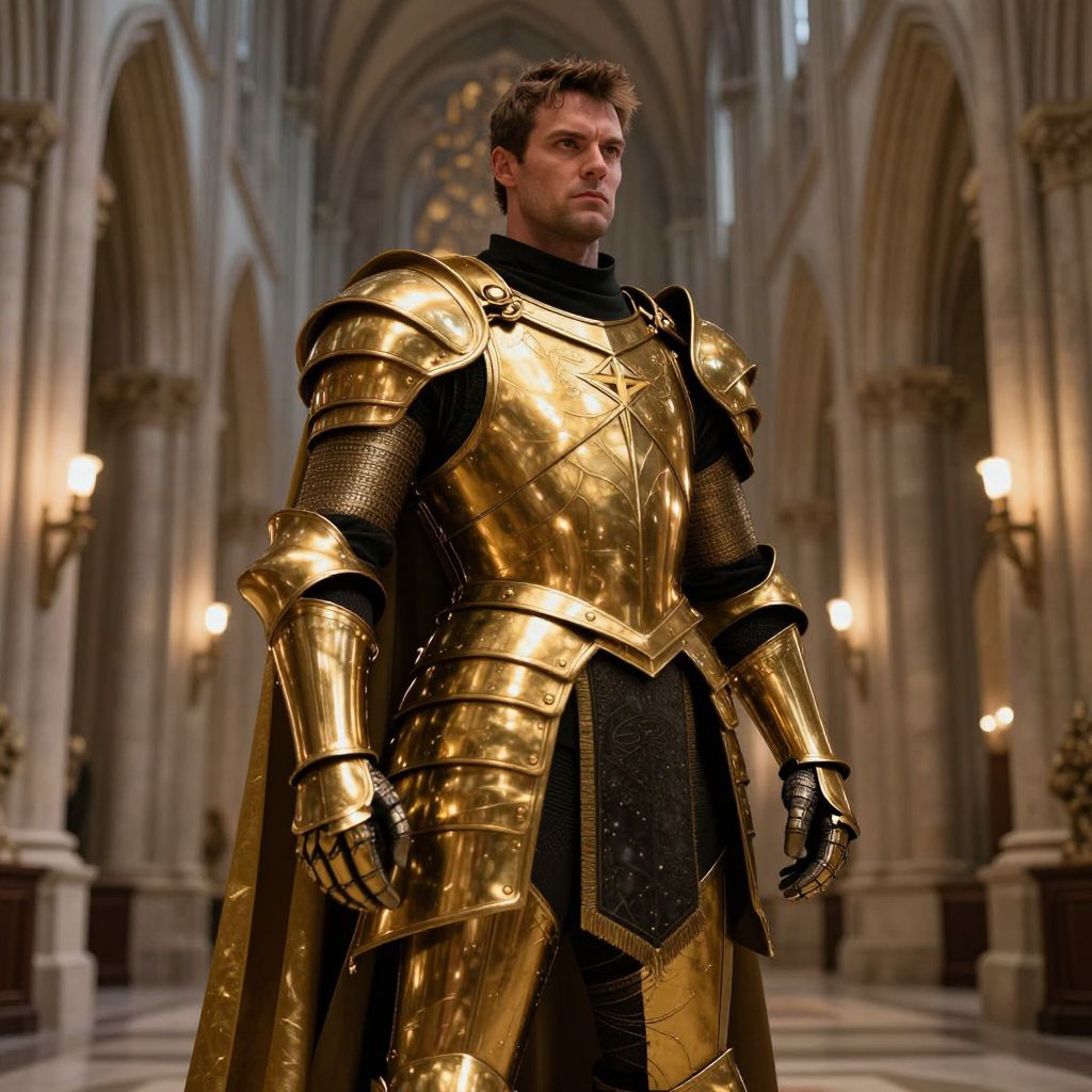 A CGI image of a muscular, serious-looking man with short brown hair, standing in a grand, dimly-lit cathedral. He's wearing shiny, gold armor with black accents and a long cape. The cathedral has tall, arched columns and soft, warm lighting from wall sconces. The man's armor is detailed with intricate designs, and he looks strong and determined.