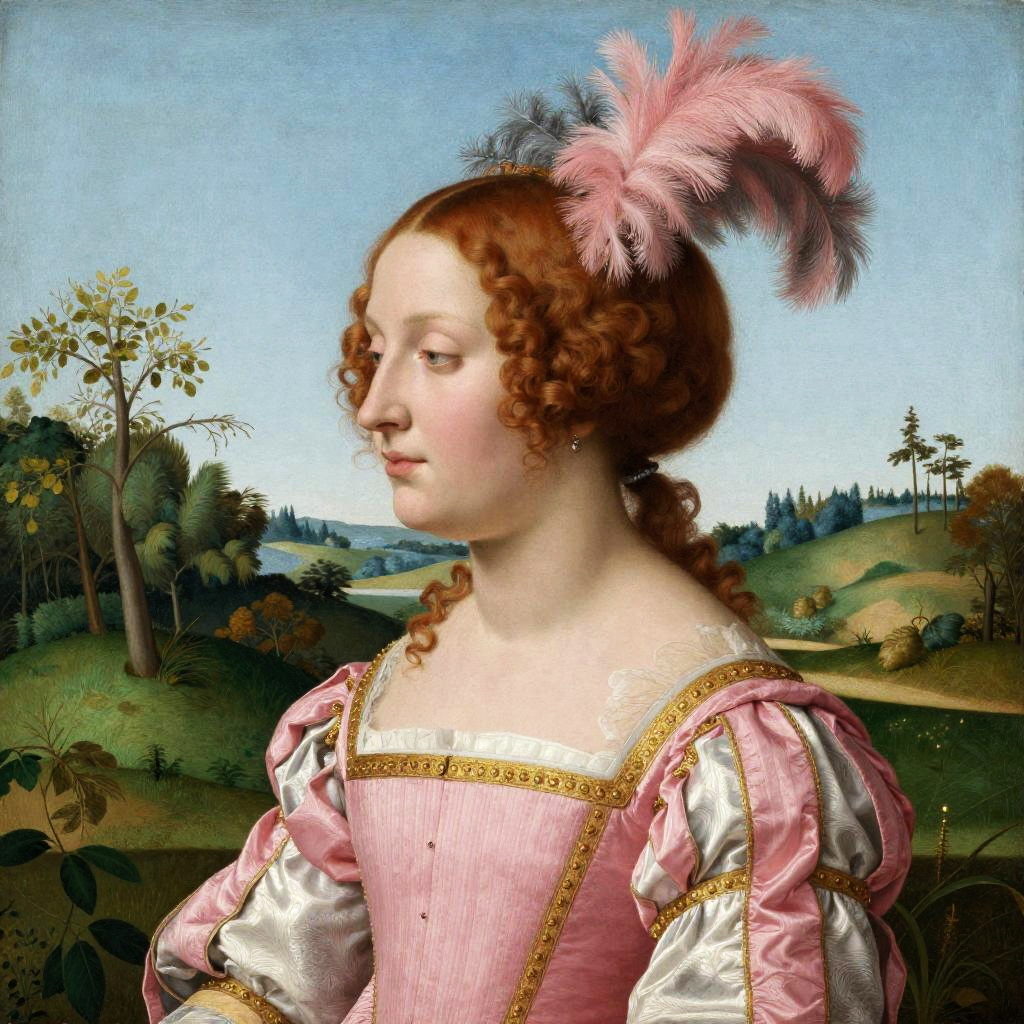 This is a digital reproduction of a Renaissance-style painting depicting a woman in profile. She has fair skin, red curly hair, and wears a pink and white dress with puffed sleeves, a gold collar, and a decorative pink and gray plume on her head. She also has small earrings. The background shows a lush, green landscape with subtle trees under a blue sky.