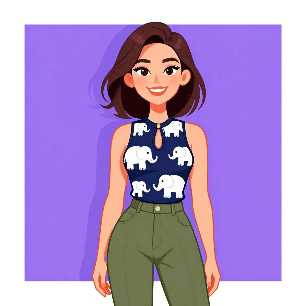 Woman with pretty face and pretty hair. Woman, casual, red sleeveless top with elephant print in a band across the midsection, scoop neckline, blue skinny jeans, light layered bracelets, pendant necklace. --sref 1467