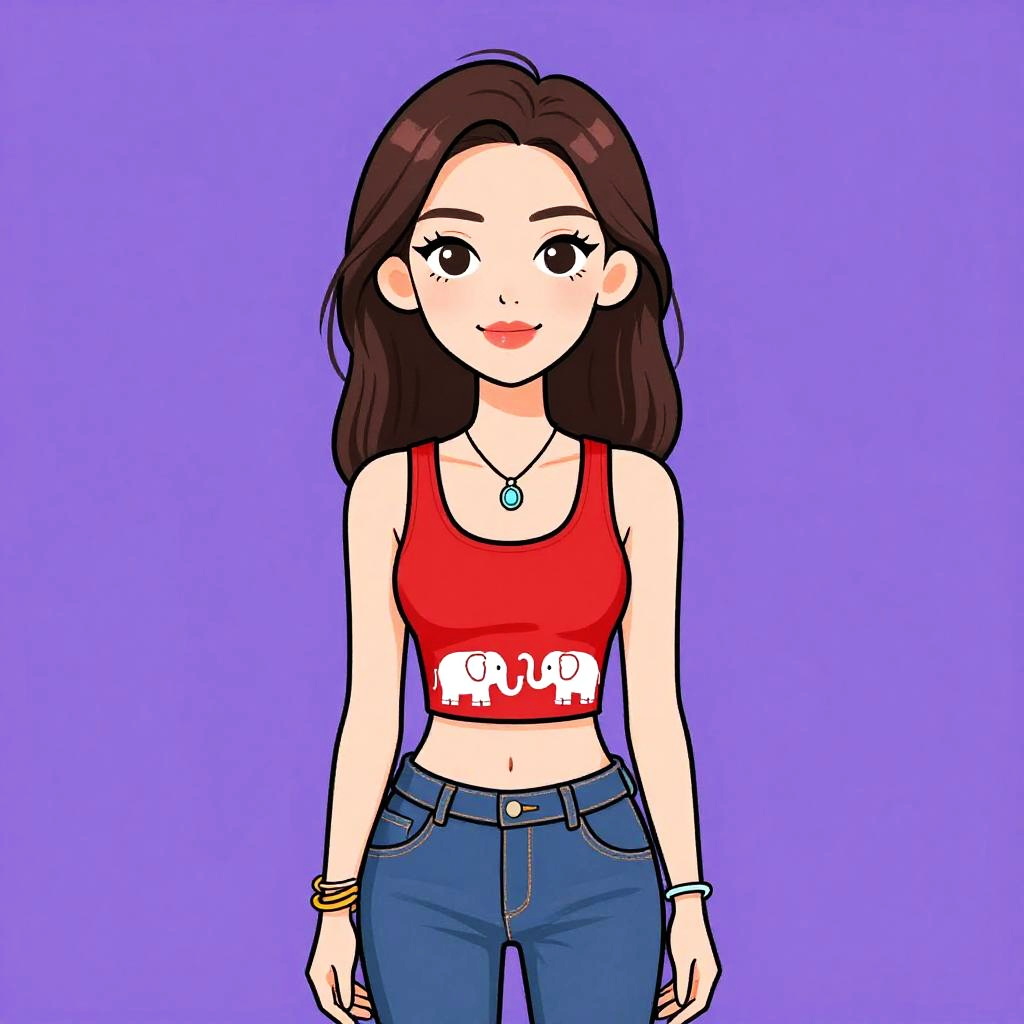 Digital anime-style drawing of a young woman with long brown hair, red crop top with white elephant design, blue jeans, purple background. She wears a