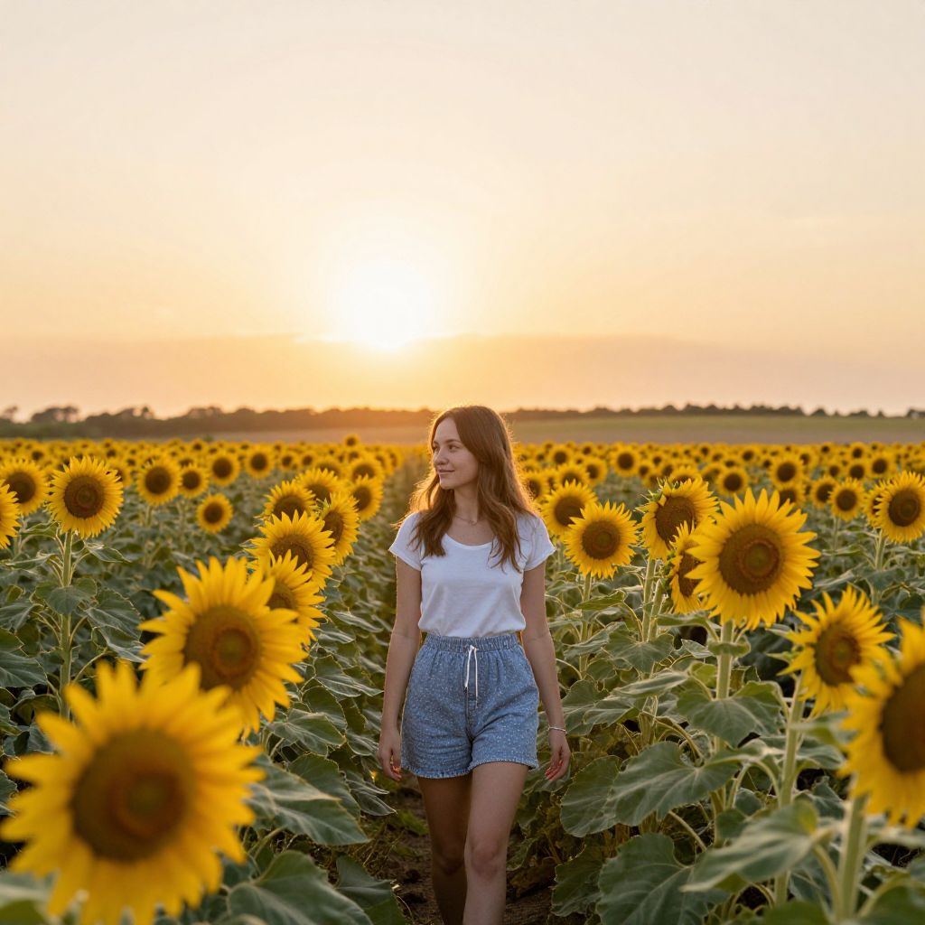 Photograph of a young woman with wavy, shoulder-length brown hair, walking through a sunlit sunflower field at sunset. She wears a white, spaghetti-strap, ruffled crop top and high-waisted, light blue denim shorts. The sunflowers, with their bright yellow petals and dark brown centers, fill the foreground and background, creating a vibrant, natural tunnel. The sky in the background transitions from a warm orange to a pale yellow, adding a golden hue to the scene. The woman's relaxed, confident stride and gentle smile convey a sense of peace and joy.