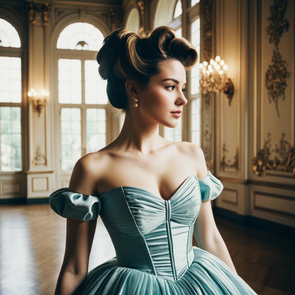 Vintage Updo hairstyle on fashion model, wearing pearl necklace and satin gown, in historic mansion ballroom, captured in fashion editorial style with muted ambient light.