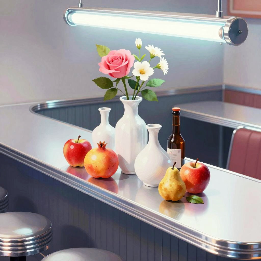 Pop art illustration, chrome diner counter with stools, still-life featuring three white vases of varied shapes and a small brown bottle with a dark top; pink roses and white flowers with lively green leaves; fruits arranged around them: a red apple, a yellow-orange pomegranate, another red apple, and a small brown pear with a green leaf; bright fluorescent light; realistic textures, crisp edges, gentle reflections, soft falloff, color-true, editorial quality