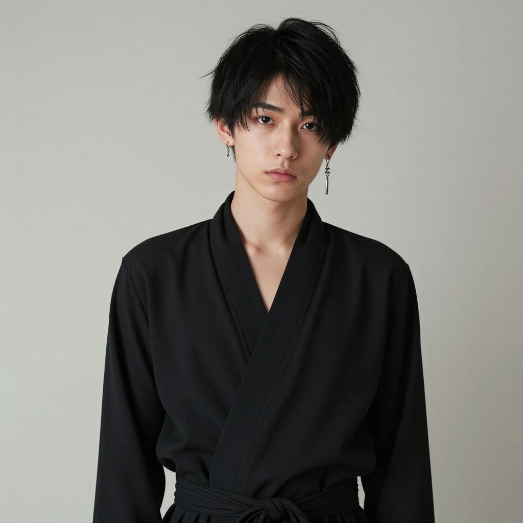 Photograph of an East Asian young man with pale skin and short, messy black hair, wearing a black, V-neck, long-sleeved kimono-style shirt. He has a slender build, small earrings with crosses, and a neutral expression. The background is a simple, light gray gradient, emphasizing his dark clothing and subtle features. The lighting is soft, highlighting his face and shirt. The overall style is minimalistic and modern.