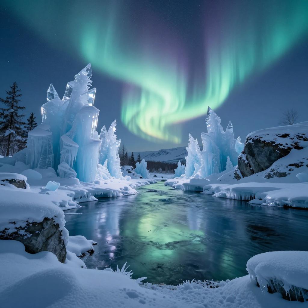 A surreal fantasy landscape featuring icy tundras with towering, sparkling ice formations. The frozen river reflects vibrant northern lights dancing across a clear night sky. Snow-covered rocks and icicles accentuate the crisp, magical atmosphere evoking a sense of wonder and adventure.