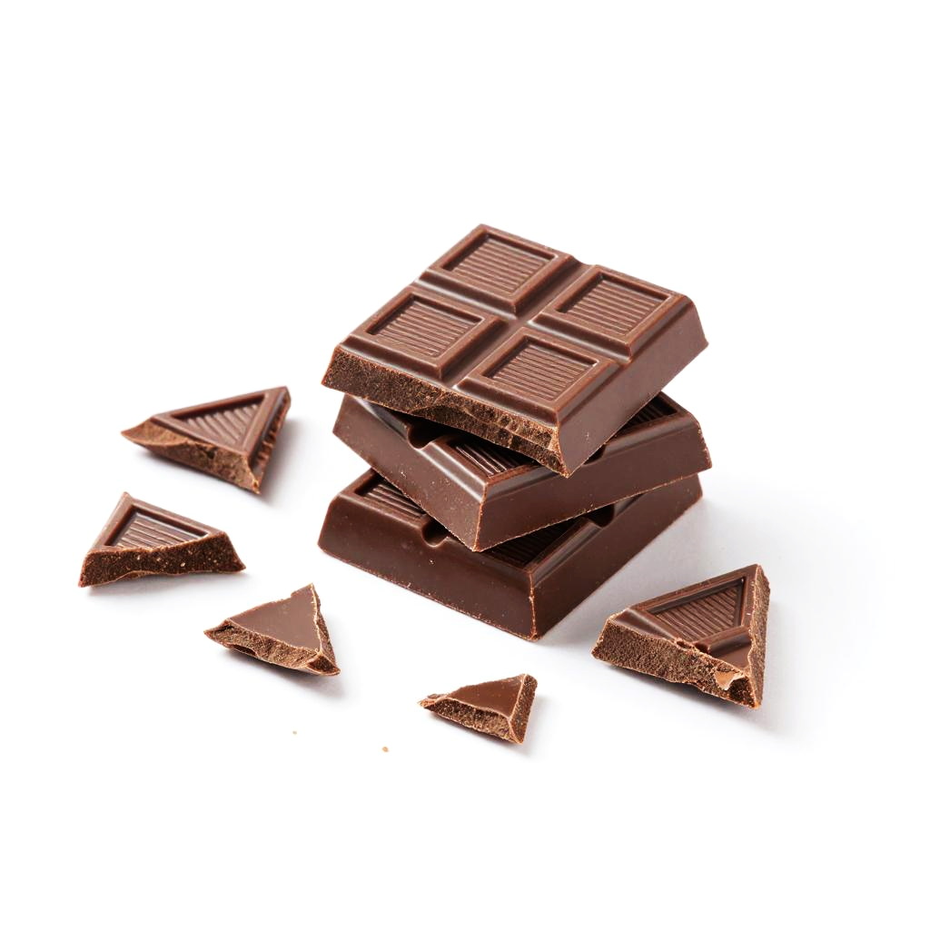 A photograph of several stacked dark chocolate squares and a pile of broken, jagged chocolate pieces. The chocolate is rich brown, and the broken pieces are scattered around the edges of the stack. The background is pure white, making the chocolate stand out prominently. The image has a clean, simple, and slightly minimalist style.
