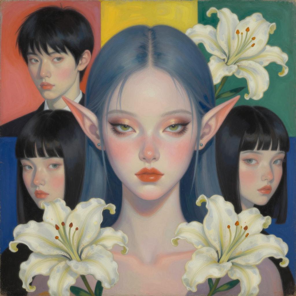 Digital artwork featuring a central female cyberpunk elf with pointed ears, long blue hair, and striking green eyes. The portrait includes three other pale-skinned figures with dark hair and subtle makeup set against a colorful background divided into red, yellow, green, and blue sections. White lilies frame the image, enhancing the composition with a painterly, pop surrealism style inspired by artists like Kupka, Miles Johnston, and Yoshitaka Amano.