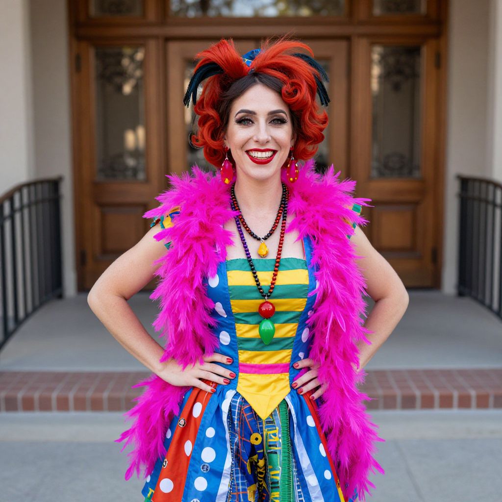 Photograph of a smiling woman with red hair in a colorful clown dress, vibrant pink feather boa, standing in front of a wooden door.