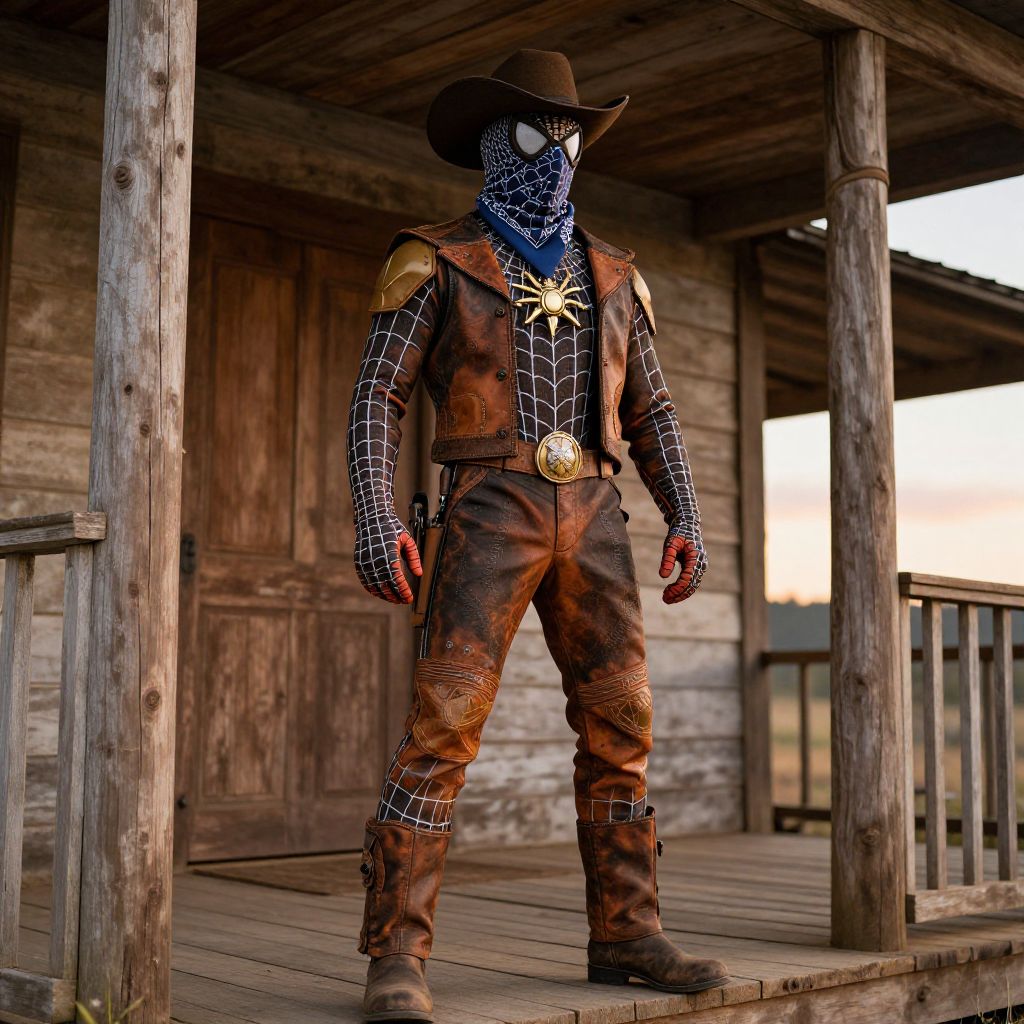 Detailed Cowboy Spiderman costume standing heroically on a wooden porch of an old western building, intricate web patterns on a rugged leather suit, sheriff badge shaped like a spider, bandana mask blending both cowboy and superhero themes, sunset lighting, vivid and textured style.