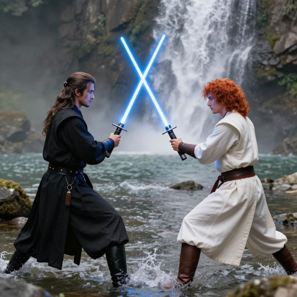 Two men engaged in an intense duel with glowing blue lightsabers in a shallow river. The man on the left has long brown hair, dressed in a black robe with black boots. The man on the right has curly red hair, wearing a white tunic with a brown belt and brown boots. Water splashes around their legs as they face each other with a waterfall cascading in the background, creating a dramatic natural setting.