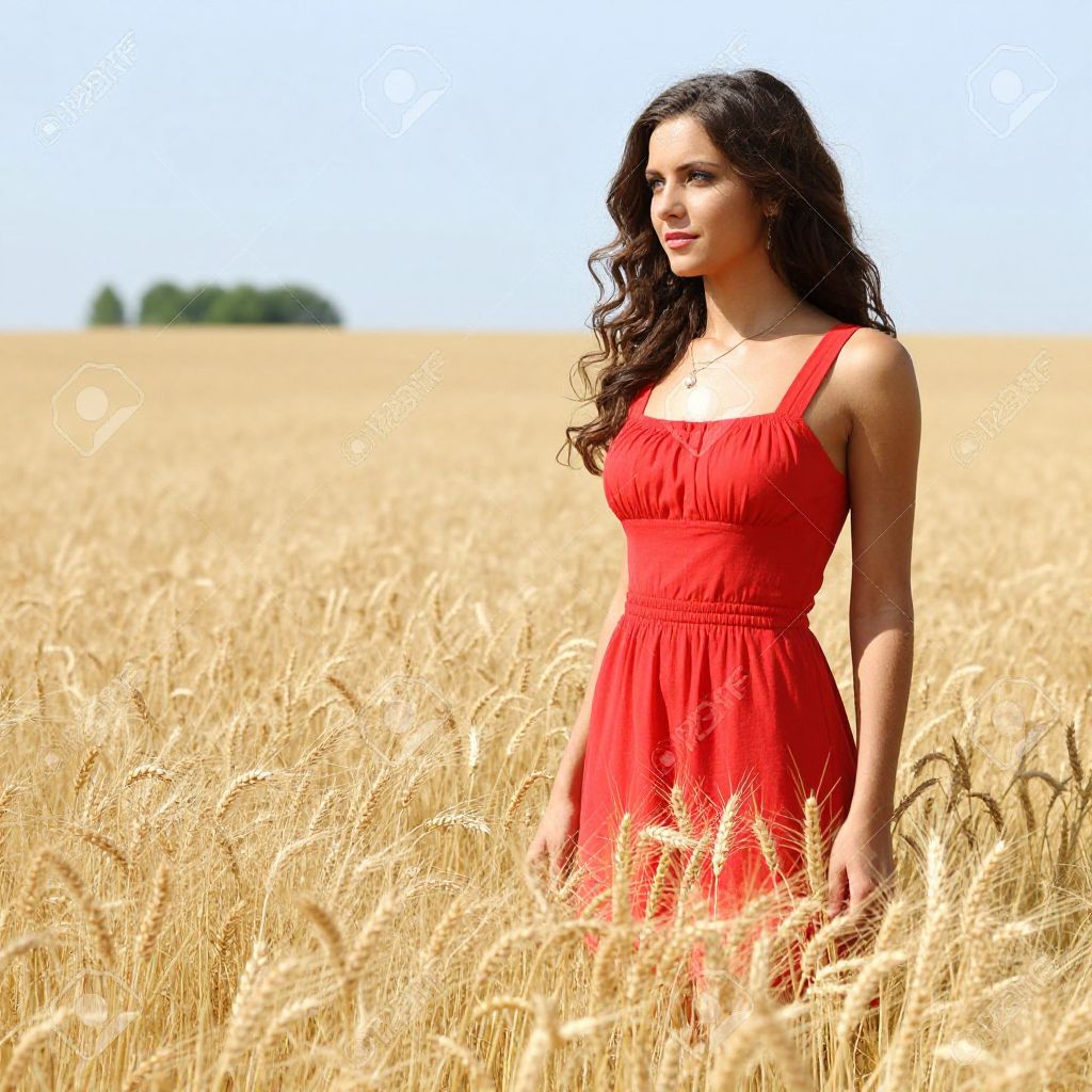 Woman in a red light dress stands in a field with yellow dry ears of wheat in the summer - 100361730