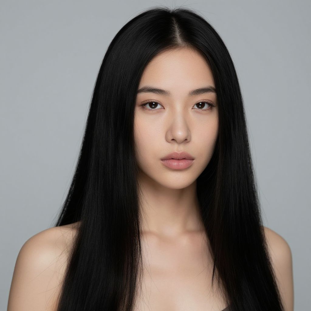 Black hair try on, a young woman experimenting with sleek, glossy black hair in front of a vintage mirror, soft natural lighting highlighting shiny strands, modern minimalist room backdrop, digital art style, subtle vibrant colors.
