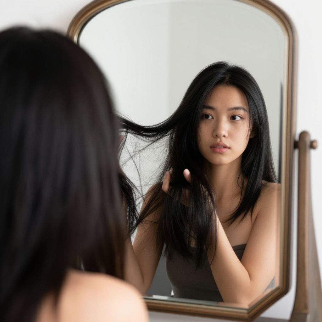 Photograph of an Asian woman with long black hair, wearing a black tank top, standing in front of a mirror, touching her hair while gazing