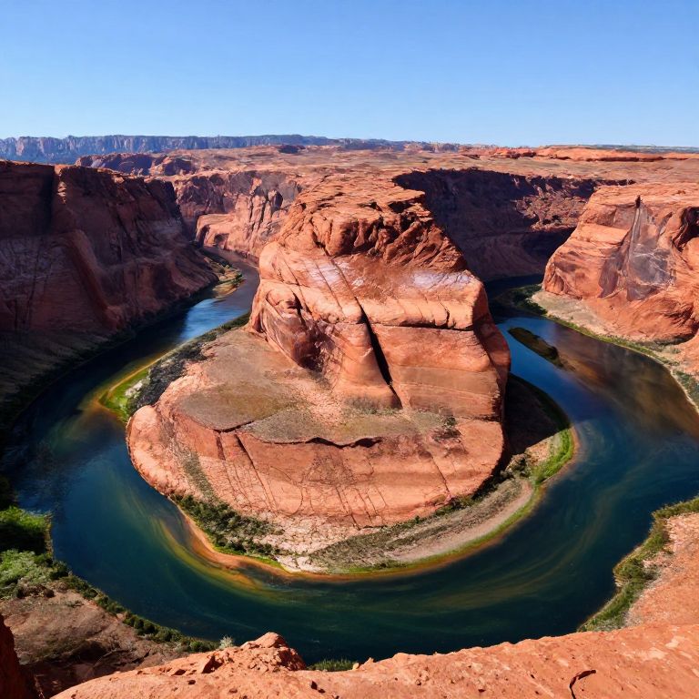 A serene 3D-rendered depiction of a Colorado River bend, showcasing vibrant red rock formations and lush greenery under a clear blue sky, with a high-definition blend of natural realism and artistic enhancement.