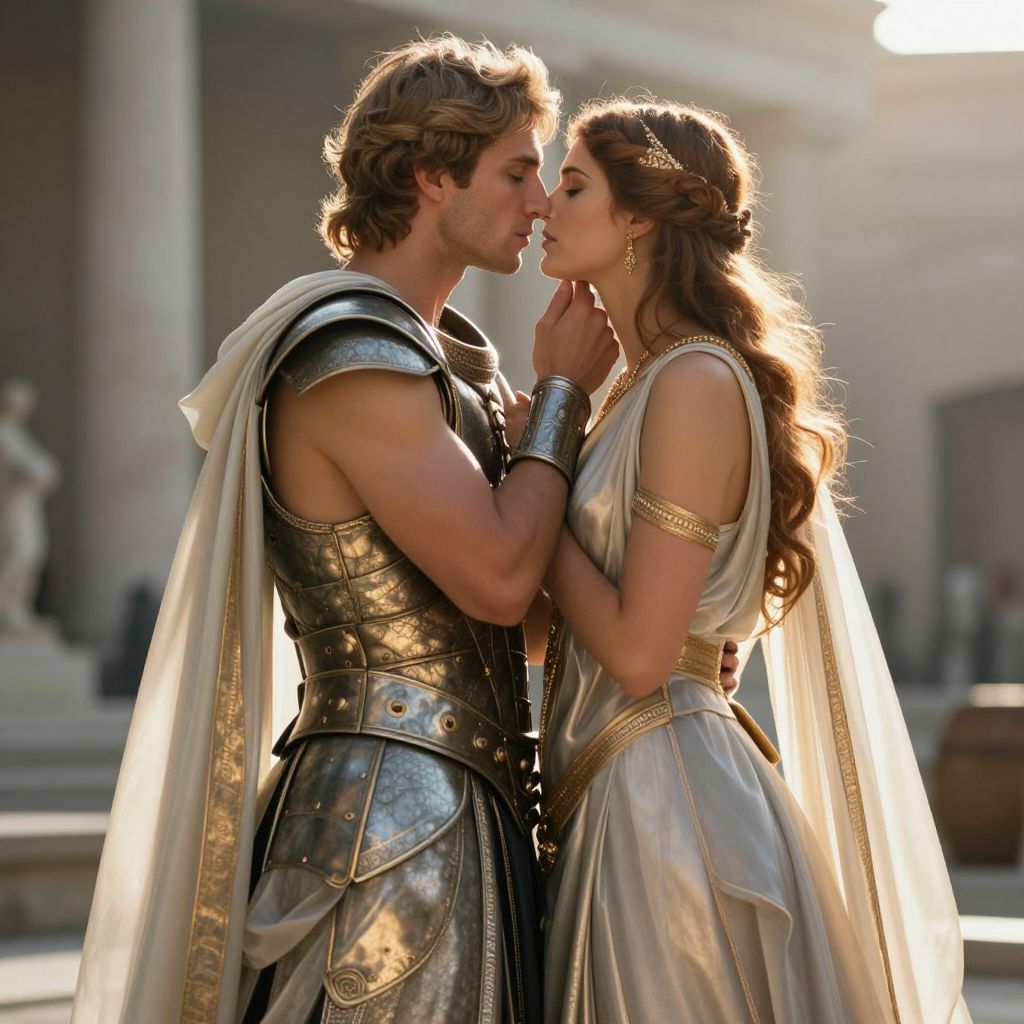 A greek god and goddess couple in love, wearing metallic armor and flowing translucent drapes, share a warm embrace, with the man holding the chin of the woman, barely kissing her lips, in a sunlit setting.