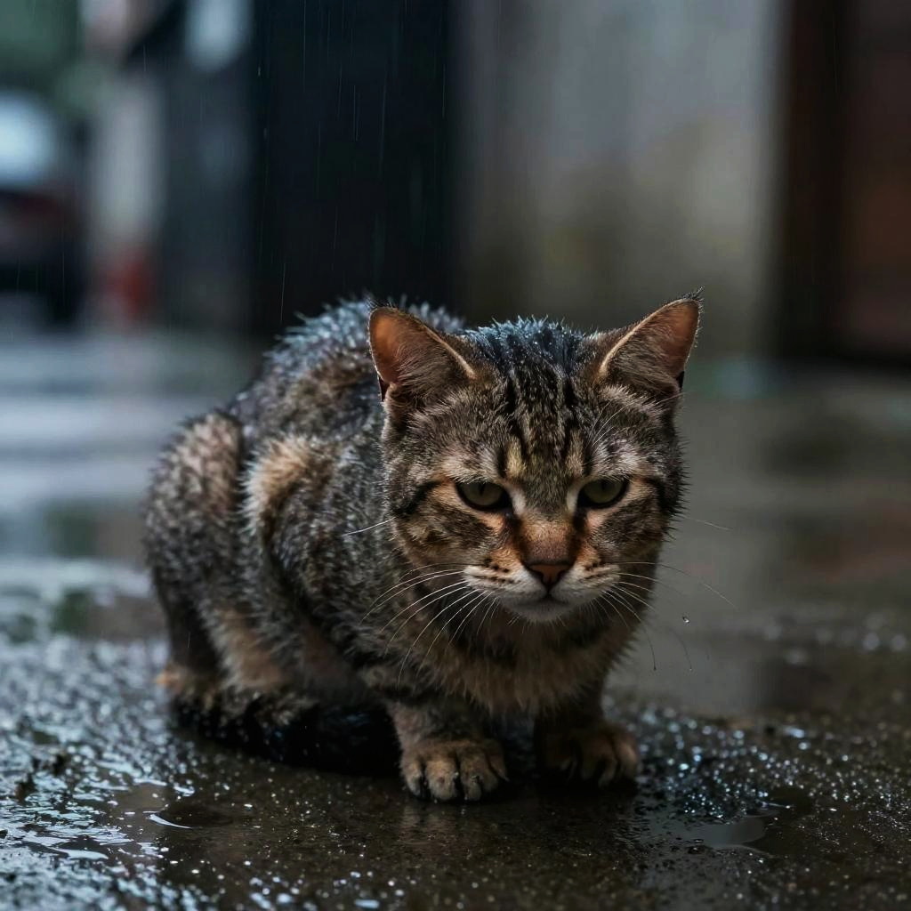 Wet cat sad, curled up on a cold concrete floor outside in the rain, water droplets falling, forlorn expression, dark and rainy urban background, cinematic style with muted tones
