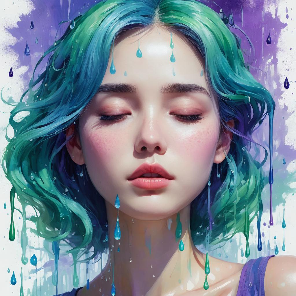 Dreamy Girl with Blue-Green Hair and Water Drops