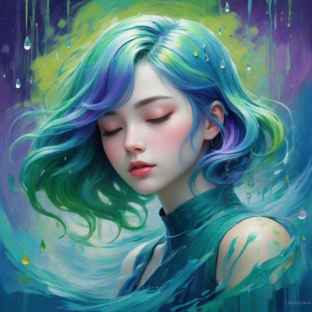 A dreamy digital illustration of a girl with eyes closed, featuring flowing blue and green hair with purple accents. The style is inspired by impressionist and gongbi art, characterized by intense lines and loose paint application with visible water drops enhancing the ethereal atmosphere.