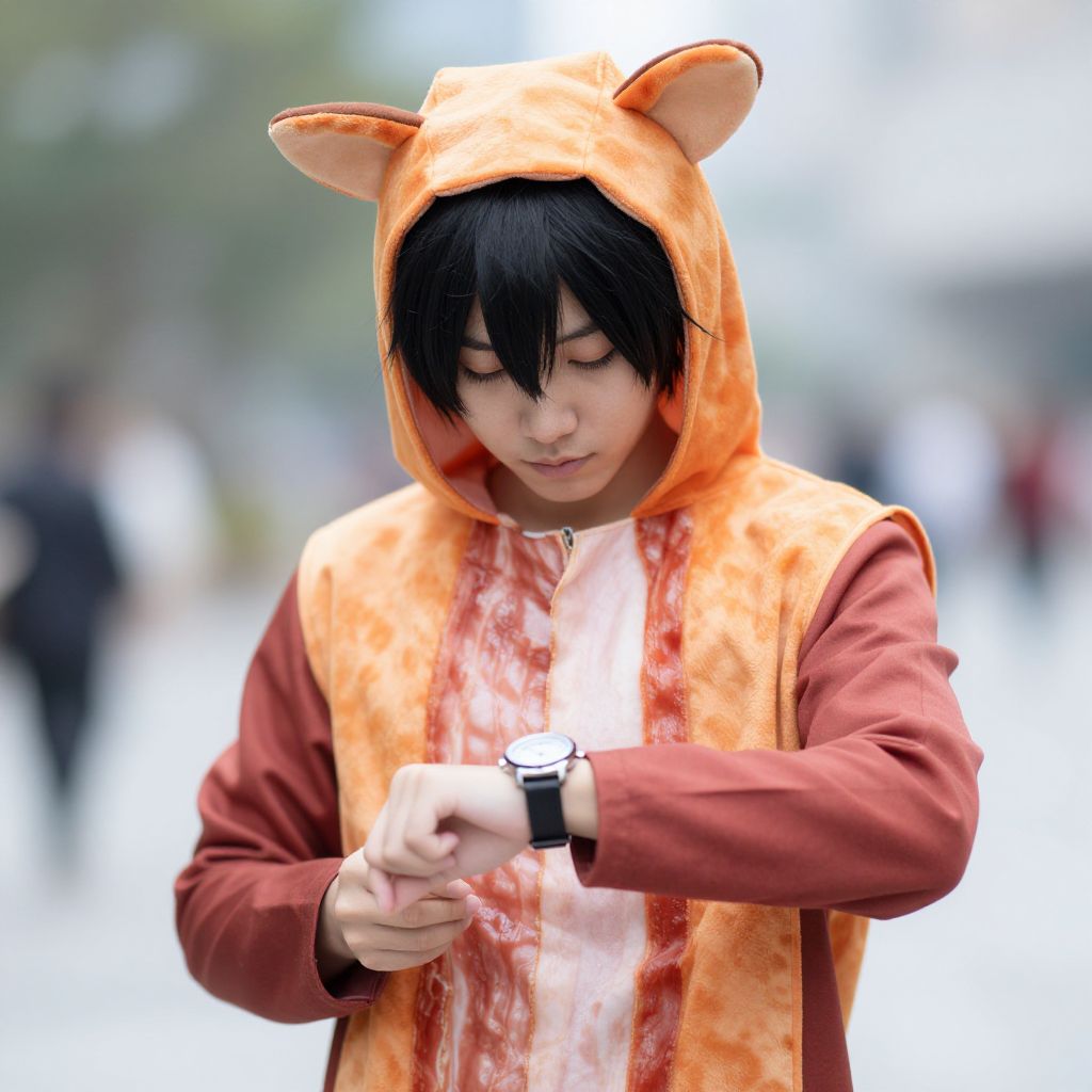 Photograph of a young Asian man with black hair, wearing an orange, hooded, animal-eared costume, focusing on his smartphone. Blurred