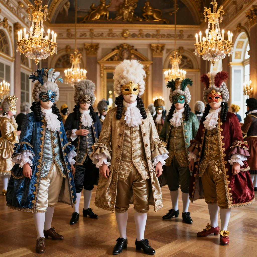 1750s fashion masquerade ball, masked guests in extravagant rococo costumes, ornate wigs, rich brocade and velvet clothing, golden chandeliers, opulent palace ballroom filled with vibrant colors