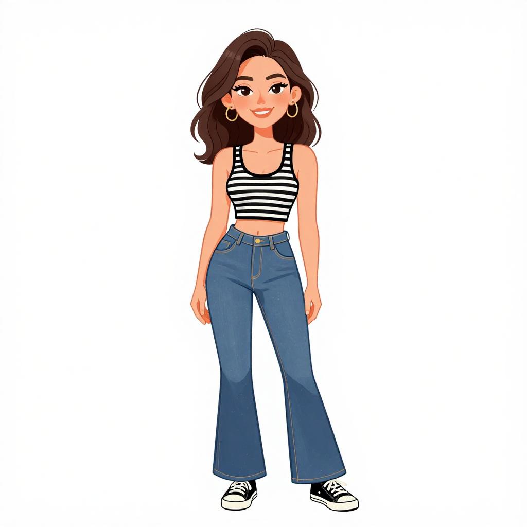 Woman with pretty face and pretty hair. smiling Woman, contemporary chic, black sleeveless jumpsuit with white contrast stitching, fitted bodice, flared leg, zipper front with circular pull, scoop neckline, casual black sneakers, subtle pendant necklace, high bun hairstyle, minimalist studio background. --sref 1467