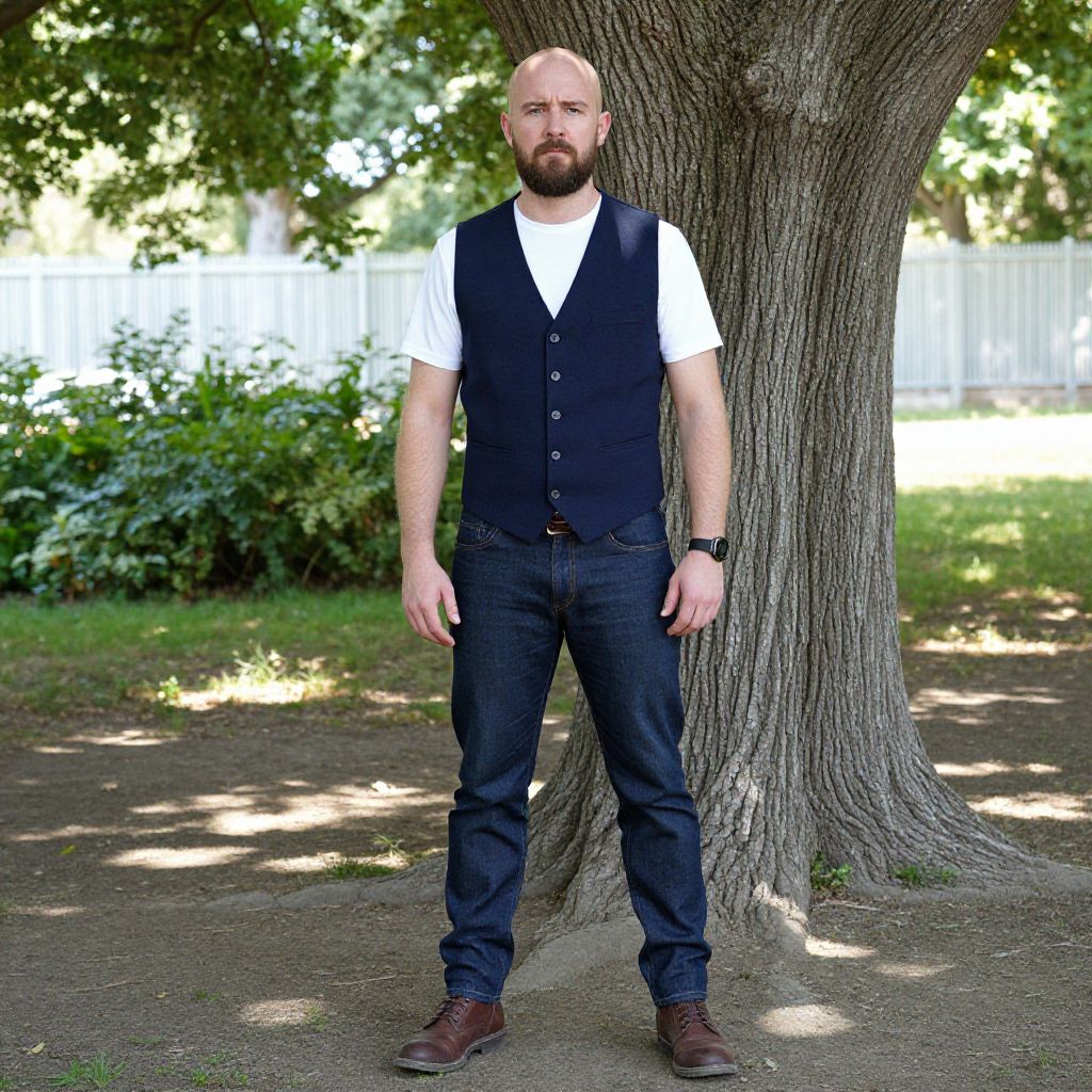 Photograph of a bald, bearded man standing in front of a large tree in a park. He's wearing a white t-shirt, navy blue vest, dark blue jeans, and brown leather boots. He has a serious expression and a black watch on his left wrist. The background shows green grass, bushes, and a white fence, with sunlight filtering through the trees.