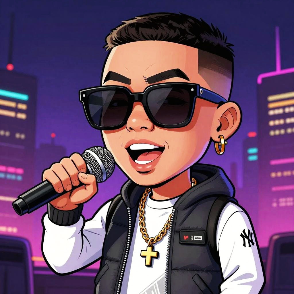 Rapper caricature depicted with oversized sunglasses, expressive facial expression, microphone in hand, wearing trendy streetwear, neon cityscape behind, bold linework and vivid palette, comic-style exaggeration capturing music energy and personality