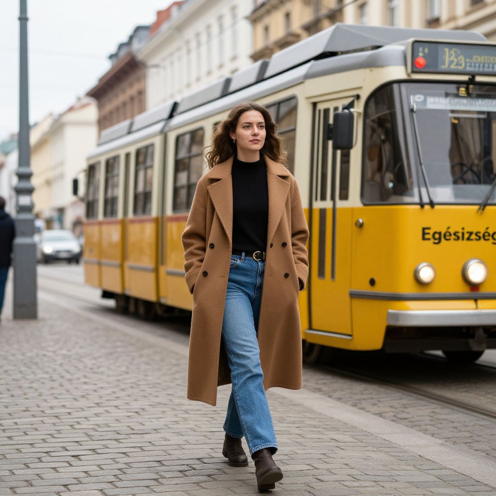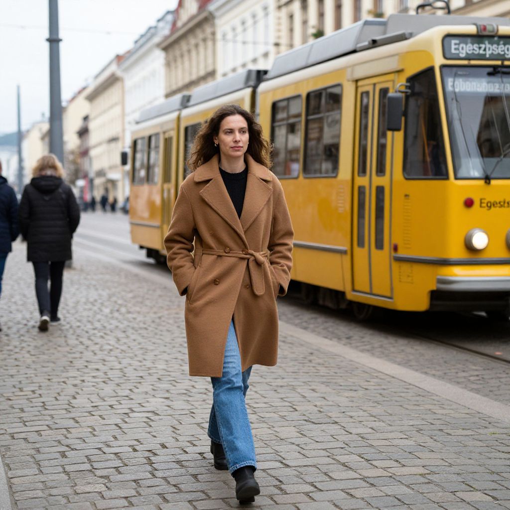Woman walking confidently on a cobblestone street in Budapest, bundled in a brown coat and blue jeans, with a vibrant yellow tram labeled \"Egészség\" passing by on the right.