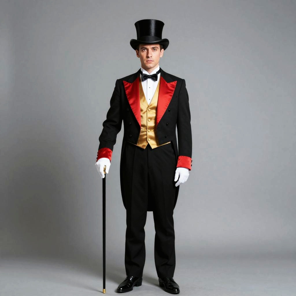 Photograph of a man standing against a plain gray background. He's dressed in a classic magician's outfit: a black tuxedo with red satin lapels and cuffs, white gloves, a black top hat, and a gold vest. He's holding a black cane in his right hand. His expression is serious, and he's looking directly at the camera. The lighting is even, highlighting the details of his outfit.