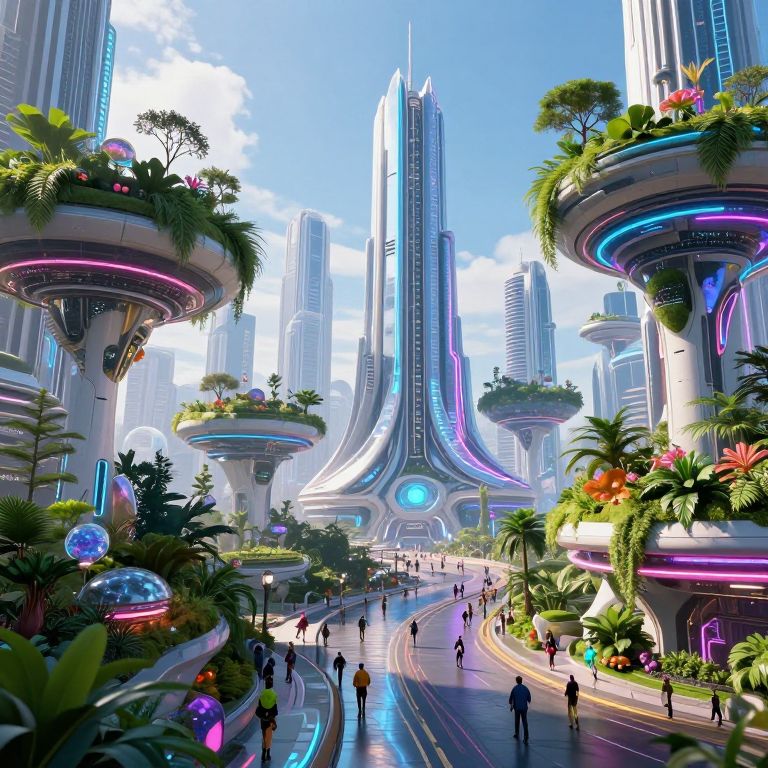 Digital artwork of a futuristic cityscape with a glowing, floating Earth at the center, surrounded by sleek buildings, colorful flowers, and floating orbs under a