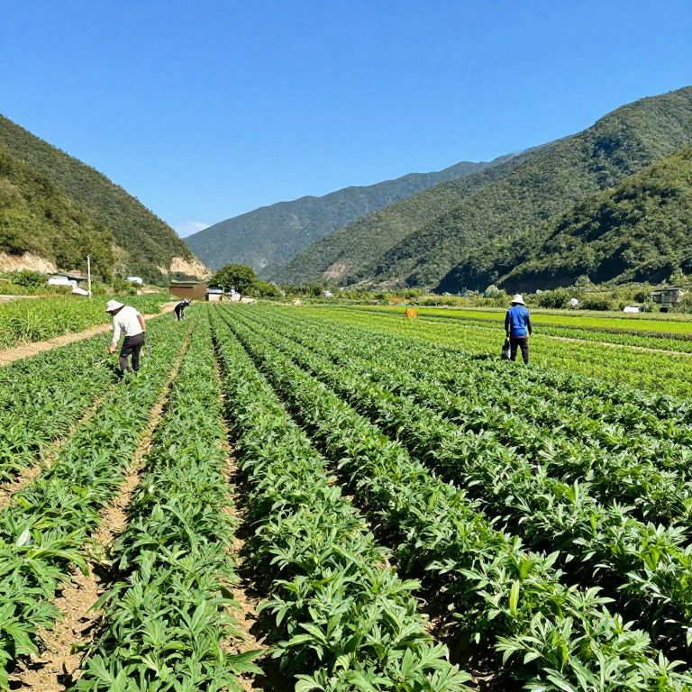 Agriculture farming in a vibrant green valley, showcasing rows of healthy crops under a clear blue sky with farmers working in the fields.