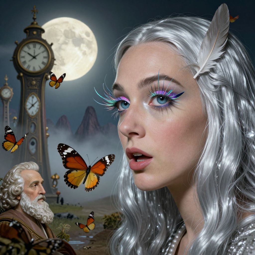 Visualize an enchanting portrait of a woman with captivating blue eyes and shimmering silver hair, reminiscent of Salvador Dali's melting clocks in its surrealistic style. She sits on a bench at the edge of a fantastical garden, where flowers bloom in vivid colors and defy gravity, suspended mid-air like distant stars. From a low-angle perspective, witness her penetrating gaze piercing through the surreal landscape as she contemplates the whimsical environment surrounding her. This dreamlike image evokes an intense sense of curiosity and wonder, blurring the boundaries between reality and fantasy in an alluring fusion of imagination and visual poetry.