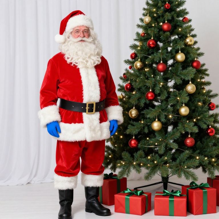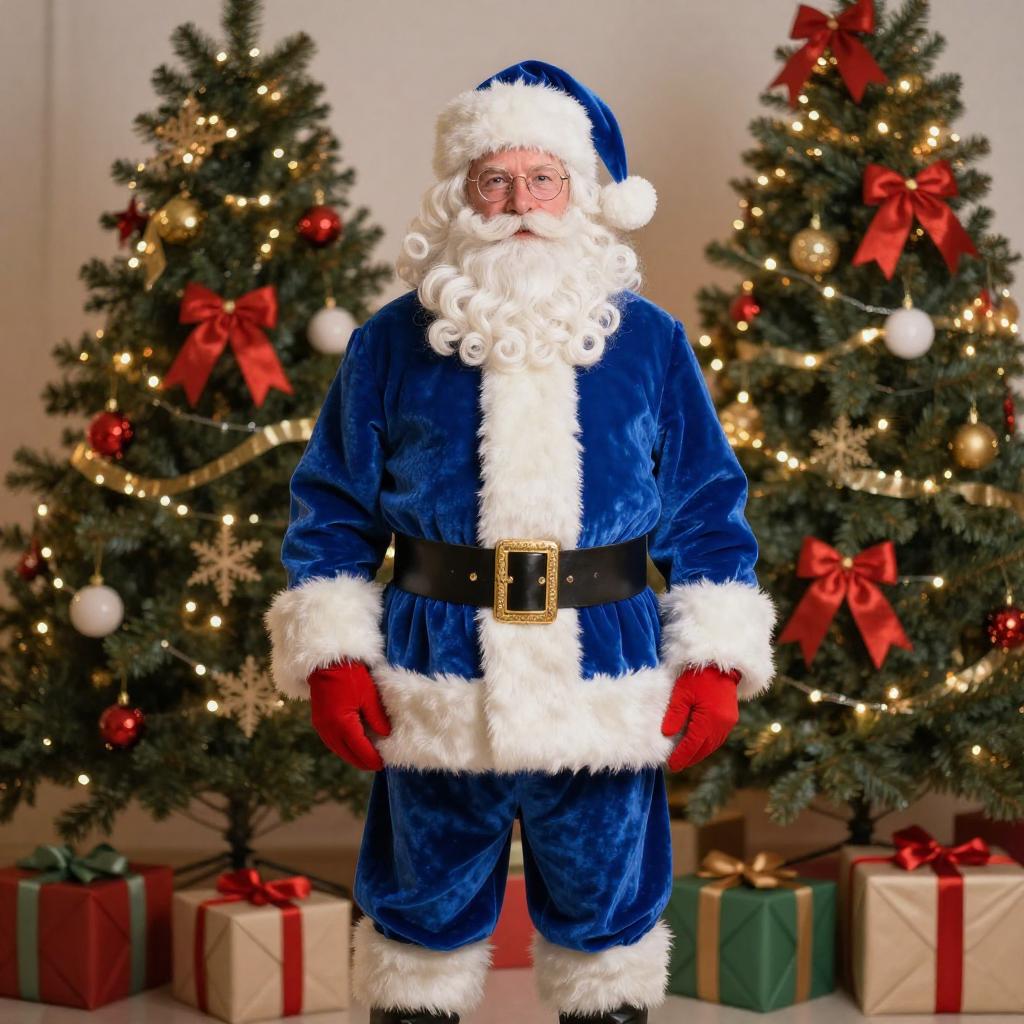 A photograph of a Santa Claus character standing in front of two decorated Christmas trees with bright lights and red ribbons. He's wearing a blue velvet suit with white fur trim, black boots, a black belt with a gold buckle, red gloves, and a blue hat with a white pom-pom. The background is slightly blurred, emphasizing the festive, colorful trees and wrapped presents.