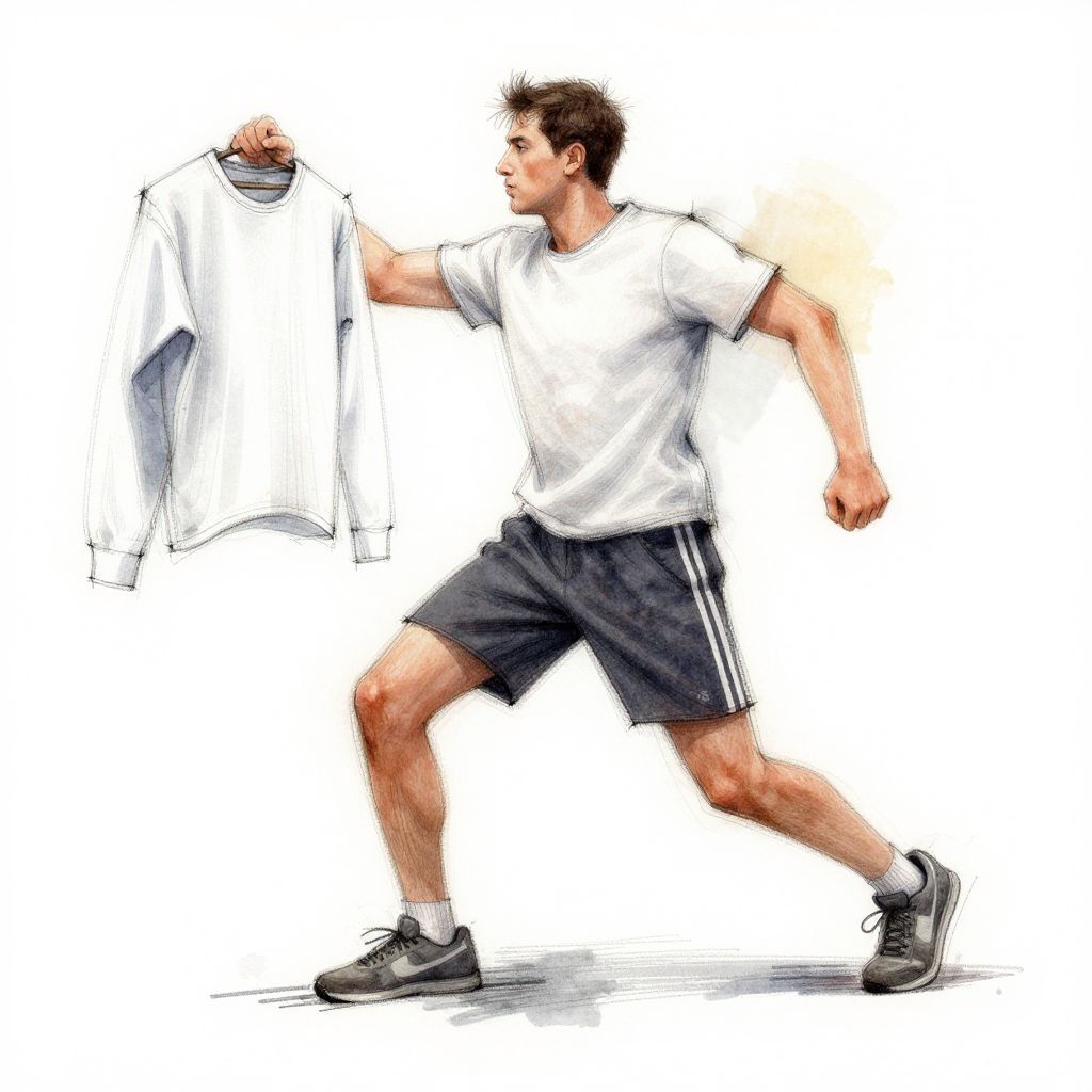 This digital drawing depicts a muscular, Caucasian man with short brown hair, wearing a white t-shirt, dark gray athletic shorts with white stripes, and black running shoes. He is mid-stride, holding a white sweatshirt in his raised right hand. The man's skin is light, and his expression is focused. The background is white, emphasizing the subject. The drawing style is semi-realistic with visible brushstrokes and a slightly exaggerated, dynamic pose, giving a sense of movement. The man's left leg is bent and forward, while his right leg is extended behind him.