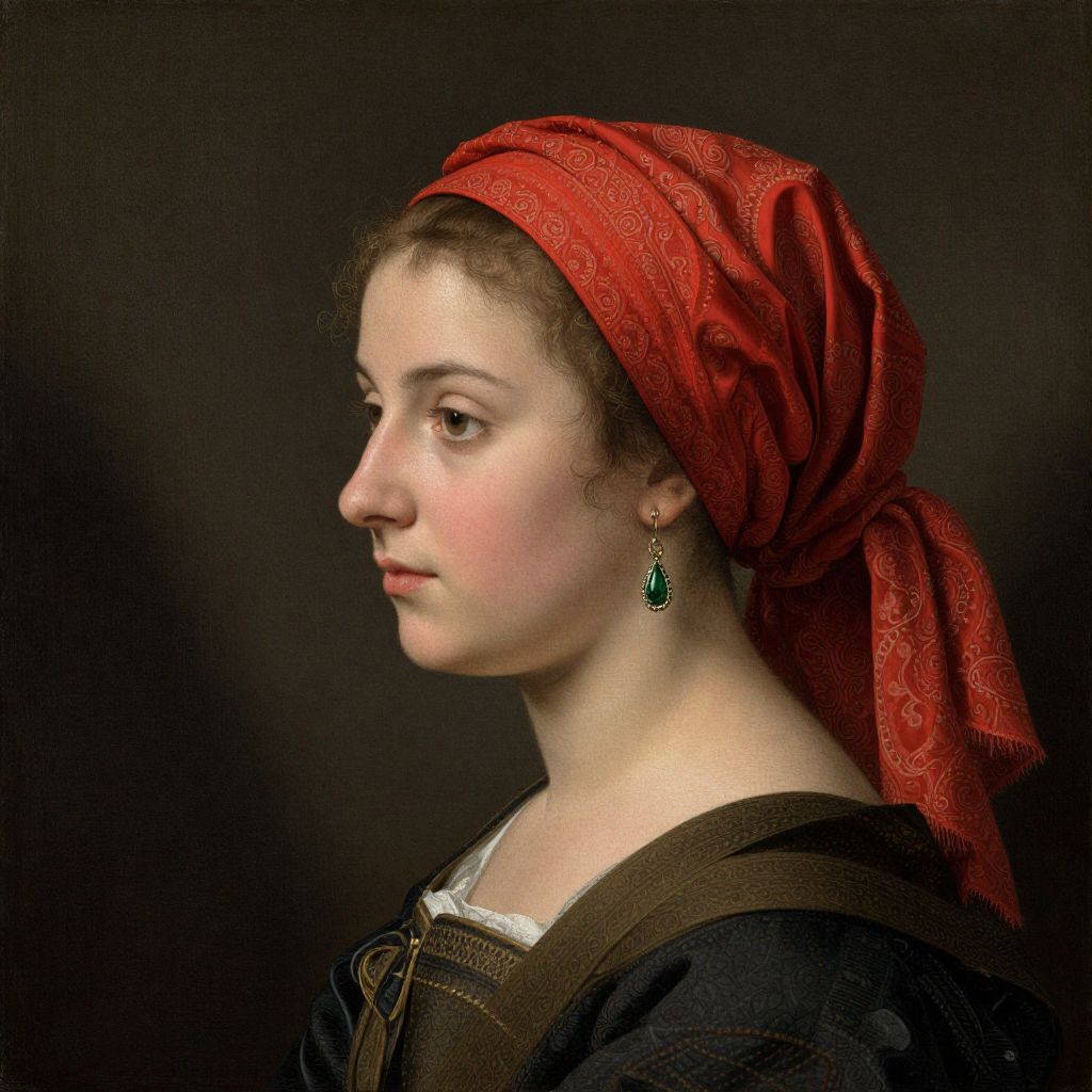A digitally rendered portrait in the style of Sofonisba Anguissola, featuring a young woman in profile adorned with a richly detailed red headscarf and elegant earrings, set against a dark, textured background that enhances the vintage and classical aesthetic.