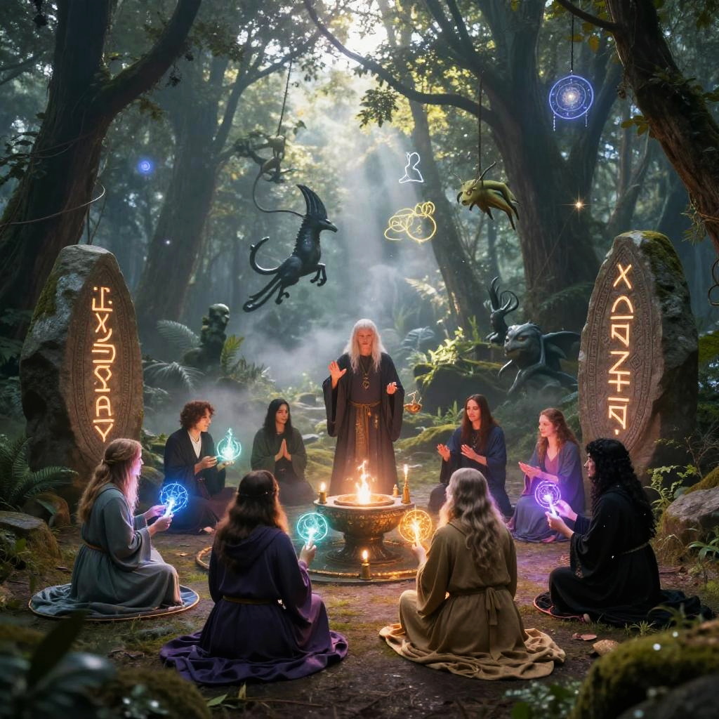 Magespace in a mystical forest where magical creatures gather, ancient stones carved with glowing runes, mages performing rituals that blend nature’s magic with elemental power, soft beams of sunlight piercing through enchanted fog.