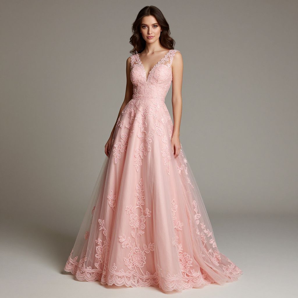 Elegant woman showcasing a stunning pink tulle lace long prom dress with intricate floral embroidery, gracefully posing against a neutral backdrop.