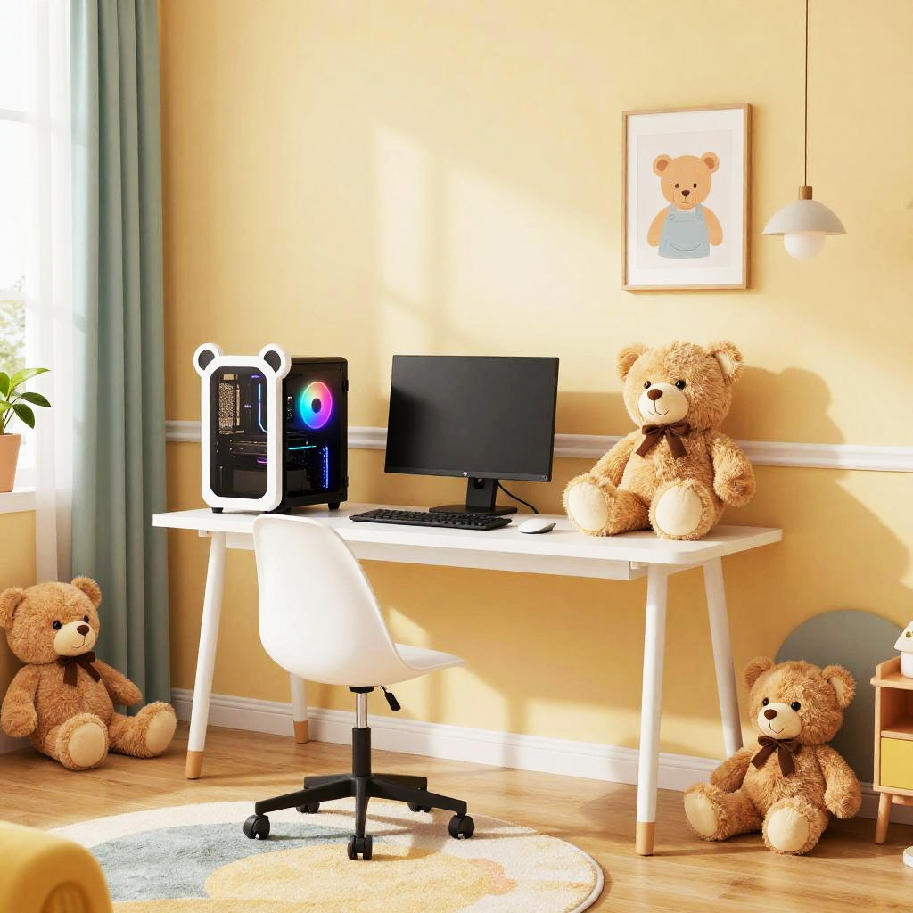 A teddy bear computer hybrid, with teddy bear features integrated into a sleek modern laptop, soft fuzzy exterior, glowing screen displaying code, surrounded by tiny floating holographic bears, futuristic and whimsical tech concept art