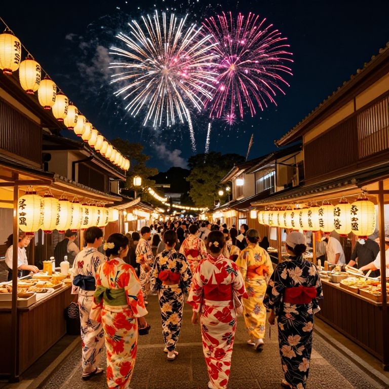 Janpan traditional festival scene with people in colorful yukata, lanterns hanging overhead, food stalls, fireworks lighting up night sky, lively joyful energy, richly detailed cultural celebration, vivid and atmospheric
