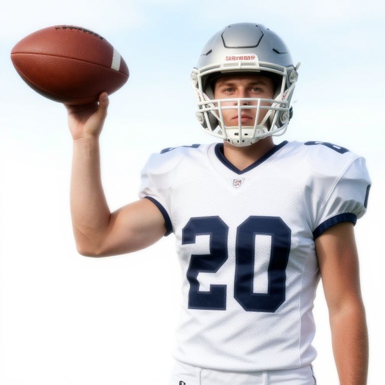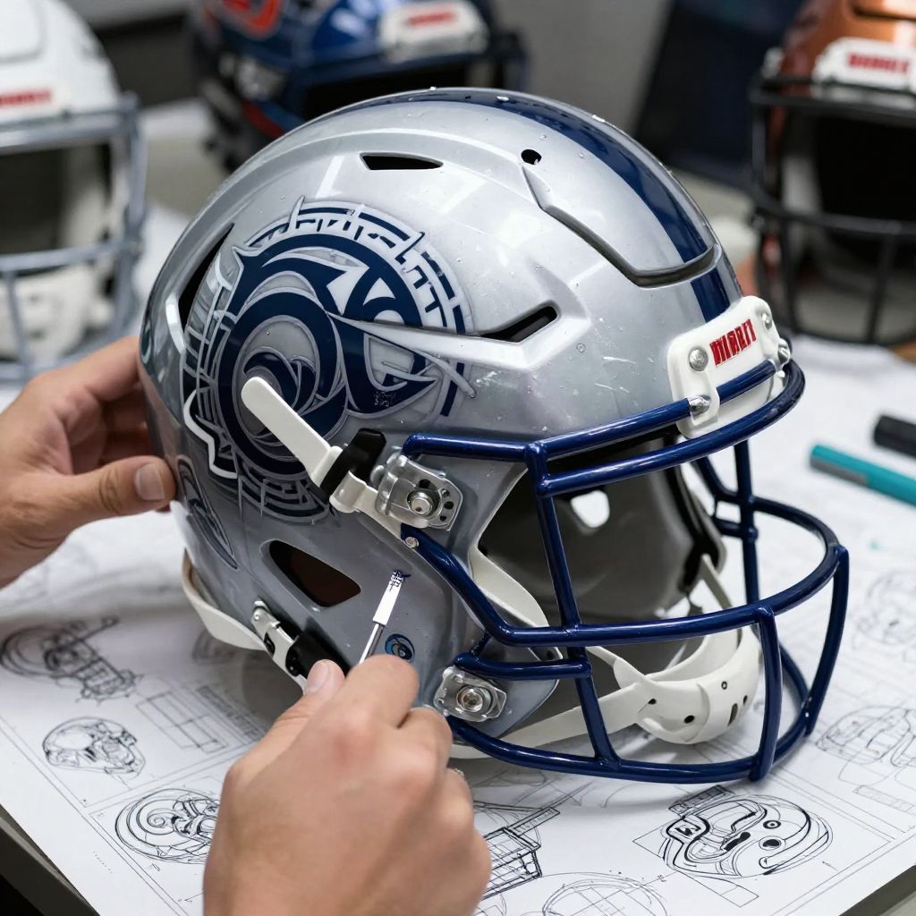 Custom football helmet maker designing bold and unique helmets with intricate patterns and innovative ventilation, close-up of hands sculpting the helmet surface, futuristic and sporty aesthetics, illuminated workspace filled with design blueprints and helmets