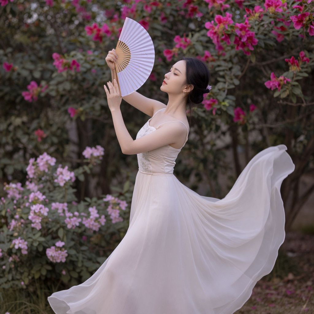 An ethereal blend of serenity and allure, the woman's poised elegance and vibrant floral surroundings evoke a timeless dance between tradition and freedom, while the soft rustle of her fan whispers secrets of quiet contemplation.