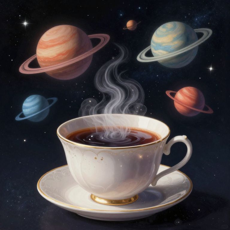 Digital artwork: Steaming white teacup with gold trim, set on a matching saucer, surrounded by colorful planets with rings in a starry