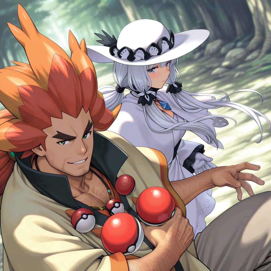 Digital anime-style artwork featuring Alder from Pokemon, a muscular man with spiked orange and red hair, facial and arm hair, wearing a poncho and holding several Pokeballs. Beside him is a young woman with long white hair tied with black ribbons, dressed in a white outfit with a decorative hat, set against a blurred forest background.