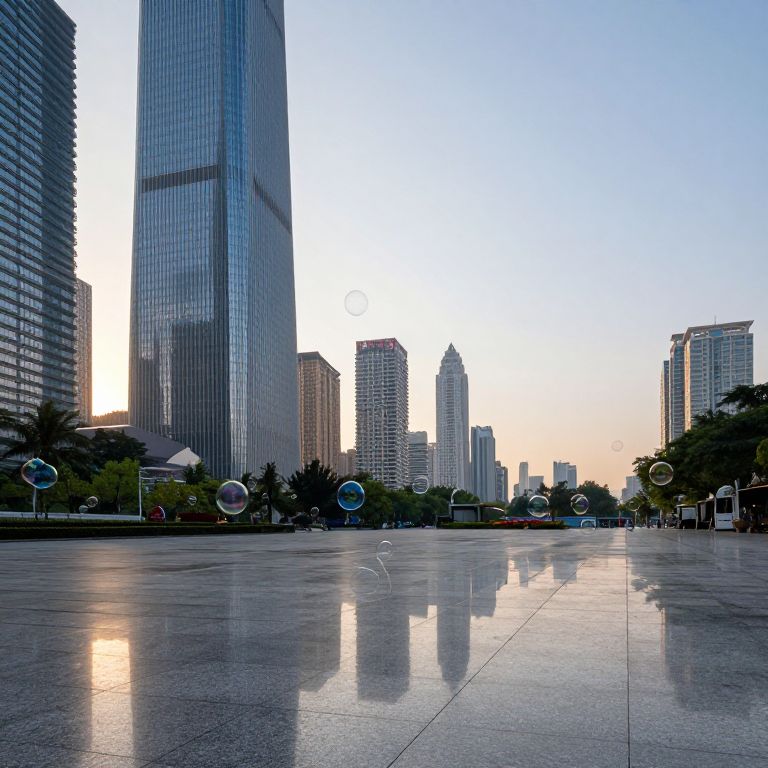 Soap bubbles float serenely across a reflective urban plaza, mirroring the towering skyscrapers and vibrant cityscape that stretch into the horizon.