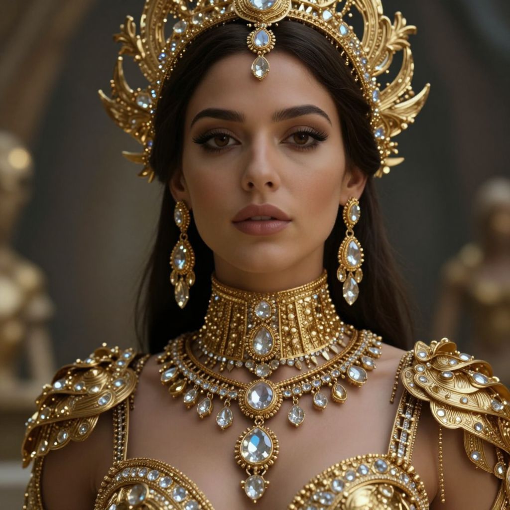Photorealistic digital image of a dark-haired woman with a regal, golden crown and jewelry adorned with large, sparkling crystals, wearing an ornate