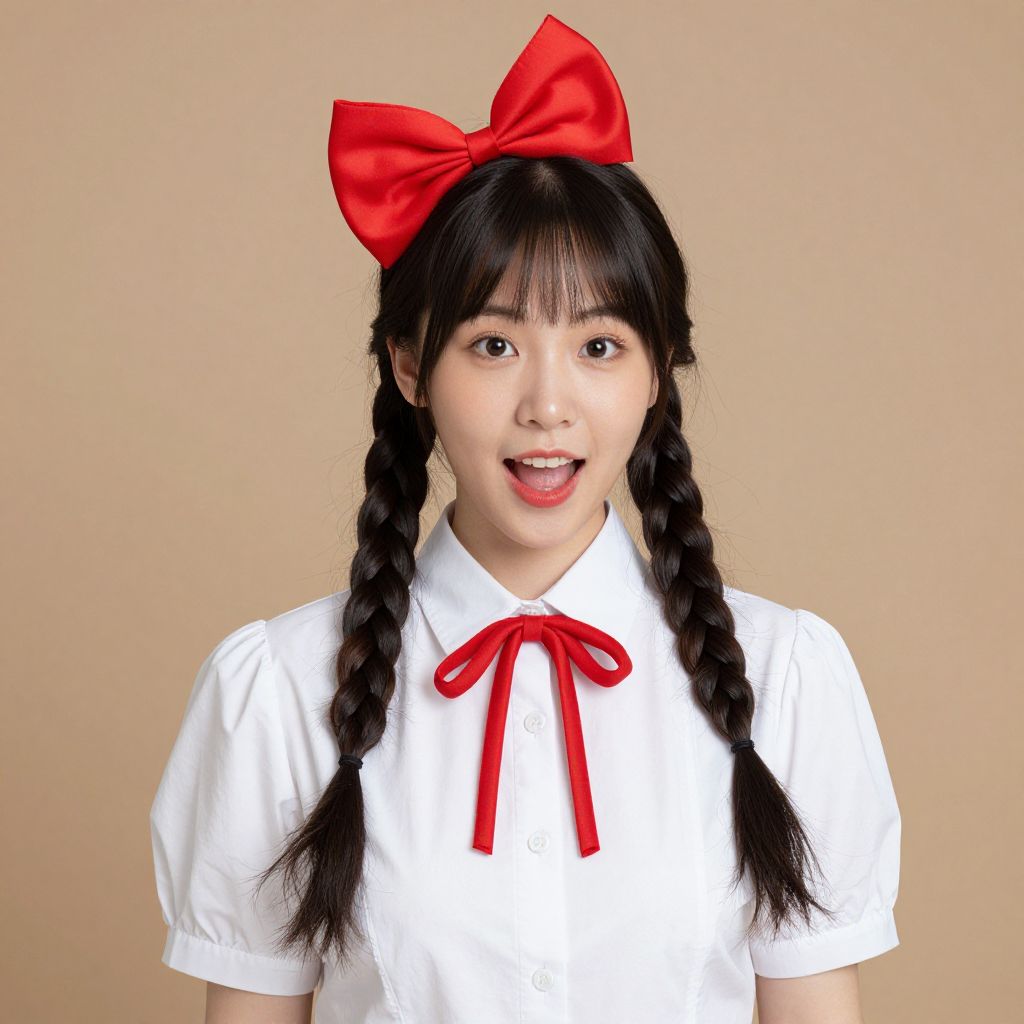 Photograph of an Asian girl with black braided hair, wearing a white shirt with a red ribbon and large red bow, smiling against a beige background