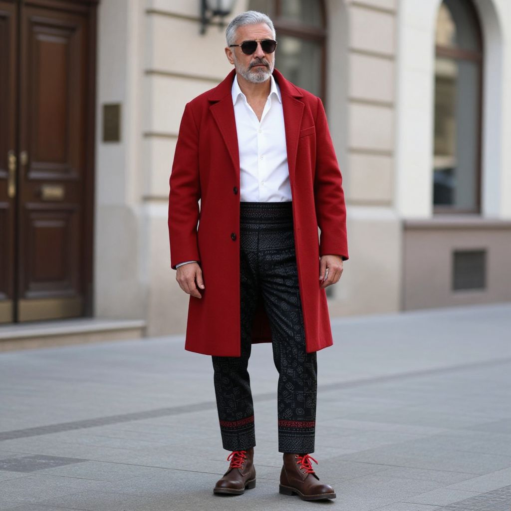 A man with grey hair wearing a red coat, white shirt, and black pants featuring a patterned design on the bottom, standing on a street with a building in the background. He is also wearing a pair of brown boots with red laces. The man has a confident demeanor, exuding a sense of style and sophistication. The scene is set in a urban environment with a clear, well-lit atmosphere, emphasizing the man's attire and the detailed pattern on his pants. The overall mood is calm and stylish, highlighting the man's appearance and the surroundings.